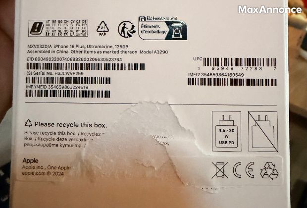 iPhone 16 plus 128 go acheté en 04/25 câble origine boîte et facture