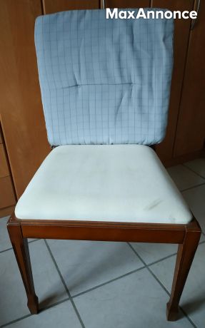 je cède ces 6 chaises rembourrées en merisier très solides parfait état en prime les 6 coussins voir,enlever&régler sur place